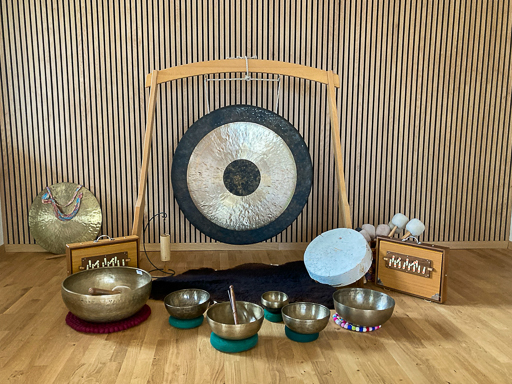 In der Klangtherapie werden Klangschalen, Gong, Monochord, Oceandrum Shrutibox, Trommel individuell auf Sie
